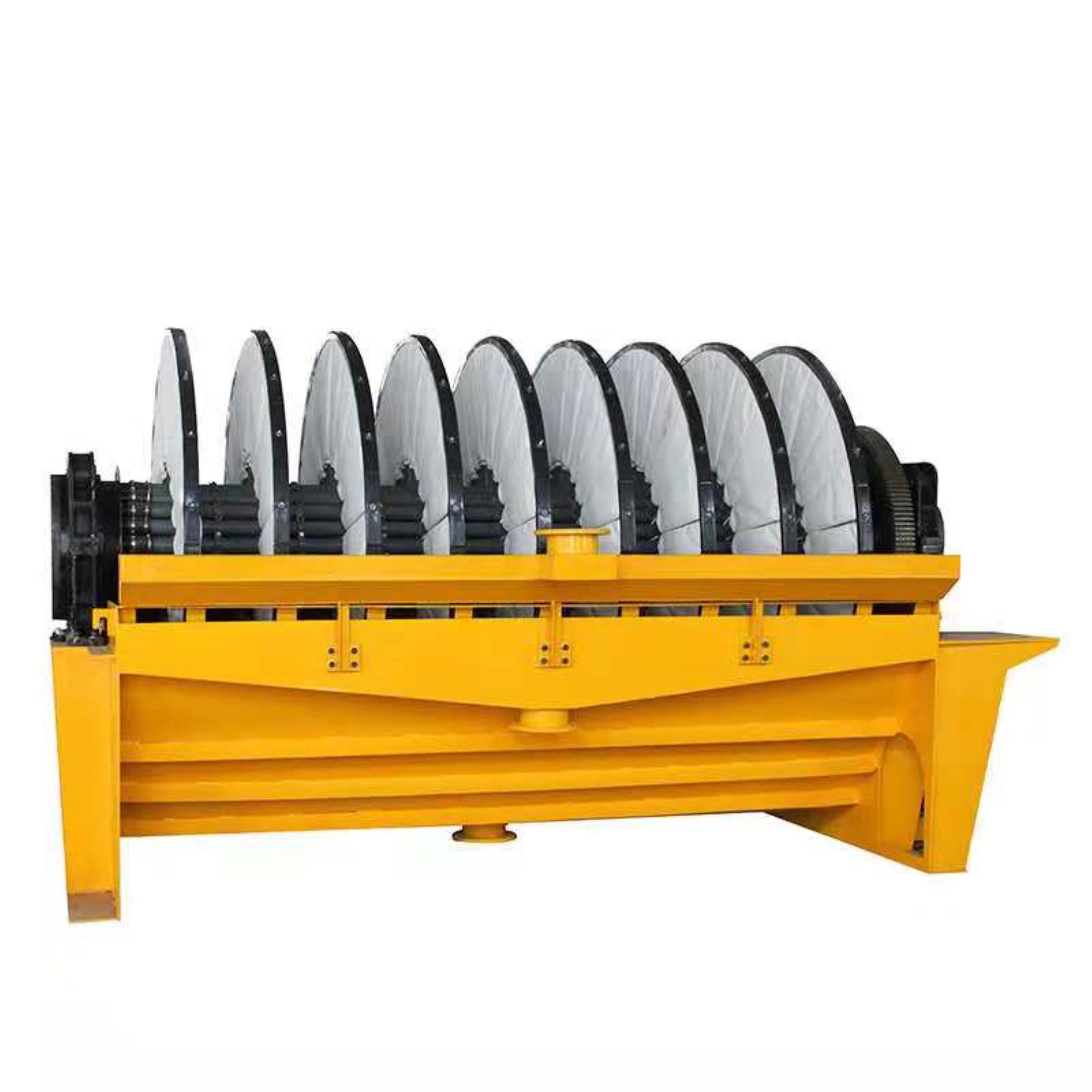 PG系列盤式真空過濾機 (1)扇形濾板脫水孔分布均勻,孔率合理,筋條尺寸大,由高強度工程塑料制成,壽命提高了2-3倍。 (2)濾液管過濾數(shù)面大,分配頭腹腔容積大,提高了抽氣率和濾液排放效果。 (3)耐磨錦綸、單或復絲濾布使脫餅率高且不易堵塞,使用壽命長。 (4)多點干油泵集中多點自動潤滑。 (5)濾布自動清洗裝置,保持了其良好的脫水效果。 (6)臥式強制高速攪拌、軸端采用橡膠及石墨盤根和水壓差三重密封不漏漿。 (7)主傳動無級變速,依物料的濃度及流量調(diào)節(jié)(交流調(diào)速電機或變頻器),以求達到理想的工作效果 。 (8)每盤由20片扇形板組成,加強了過濾過程控制,成餅厚度均勻。 (9)磨擦片采用特制耐磨硼鑄鐵,剛?cè)嵯酀芊饧眩褂脡勖_到十年以上。 (10)濾液管為高強度耐磨陶瓷復合鋼管,提高壽命10倍以上。 (11)濾液管與濾扇接口去掉下法蘭,采取模具定位直接焊接,減少了90%可能的漏氣點。